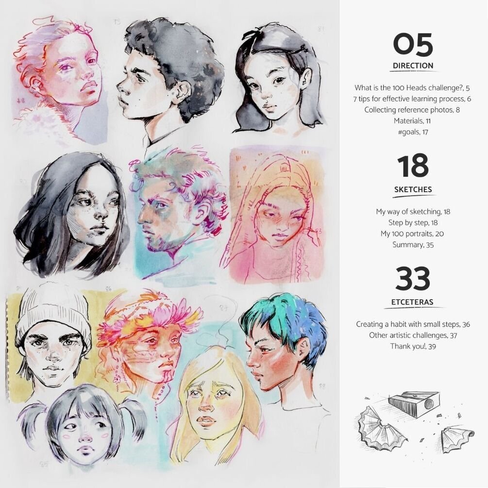 E-Book presents my way of practicing portrait drawing with the "100 Heads Challenge" by Ahmed Aldoori. It was my second attempt to this challenge which I did in 2022 ✏️
