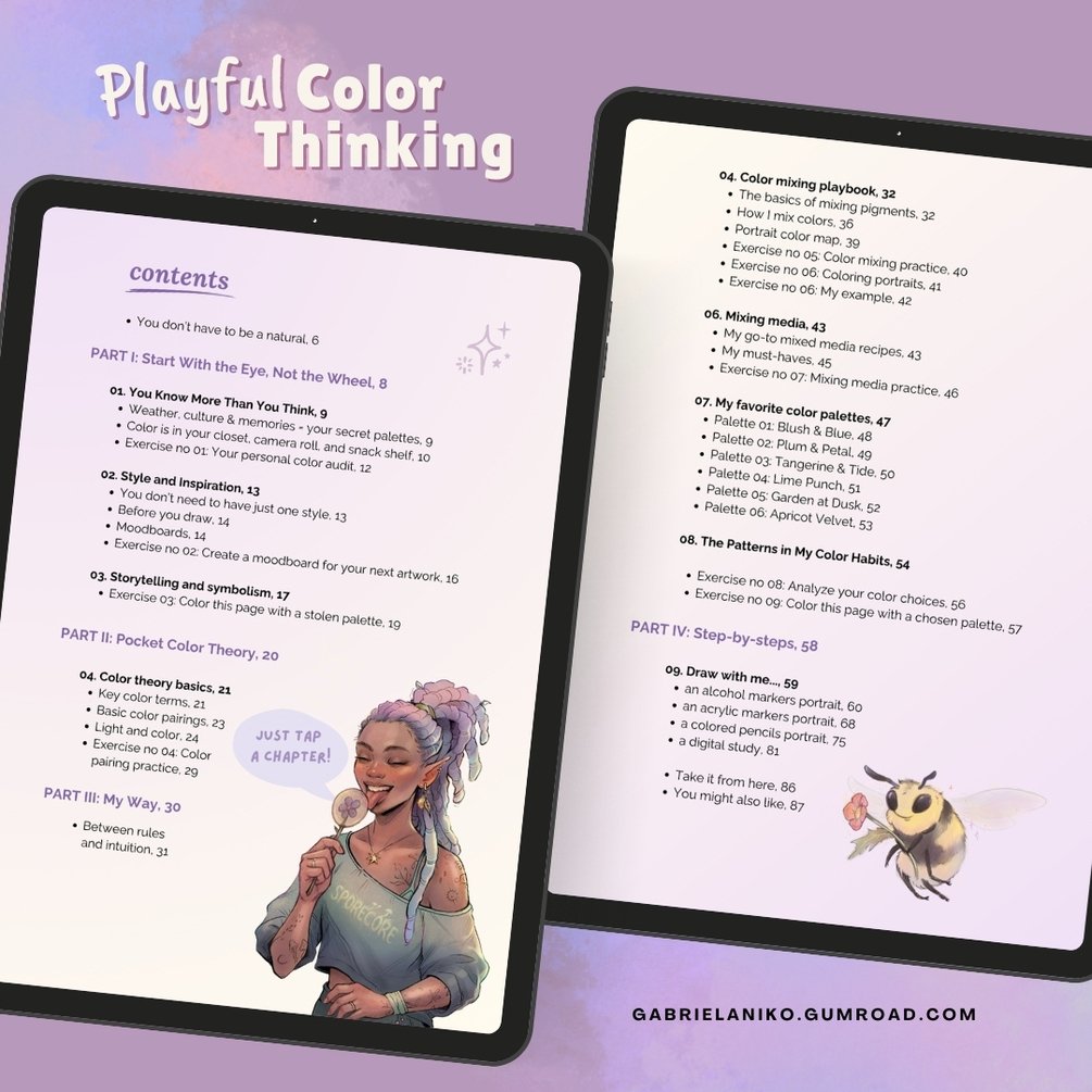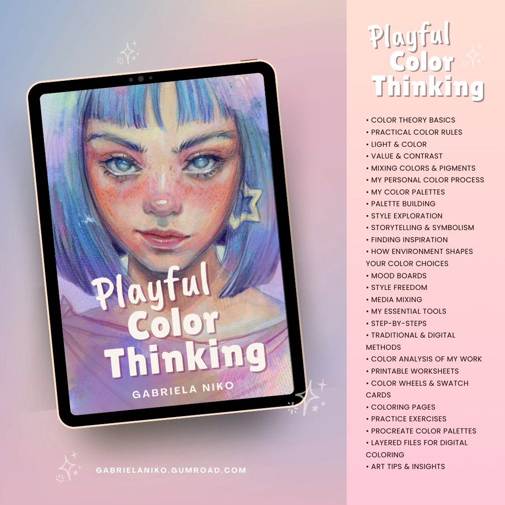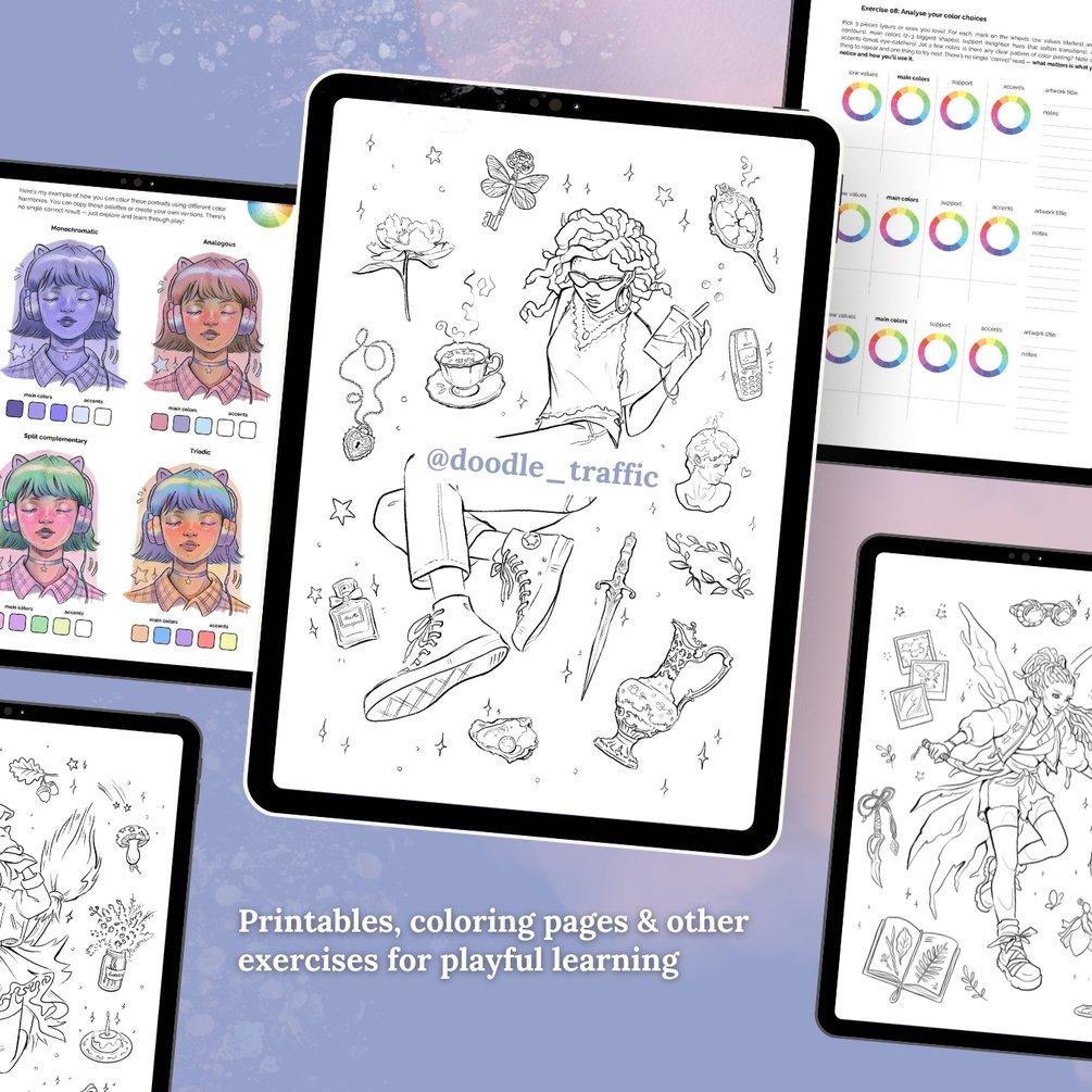"Playful Color Thinking" E-Book, printable Practice Worksheets and coloring pages, files for digital coloring, custom Procreate color palettes
